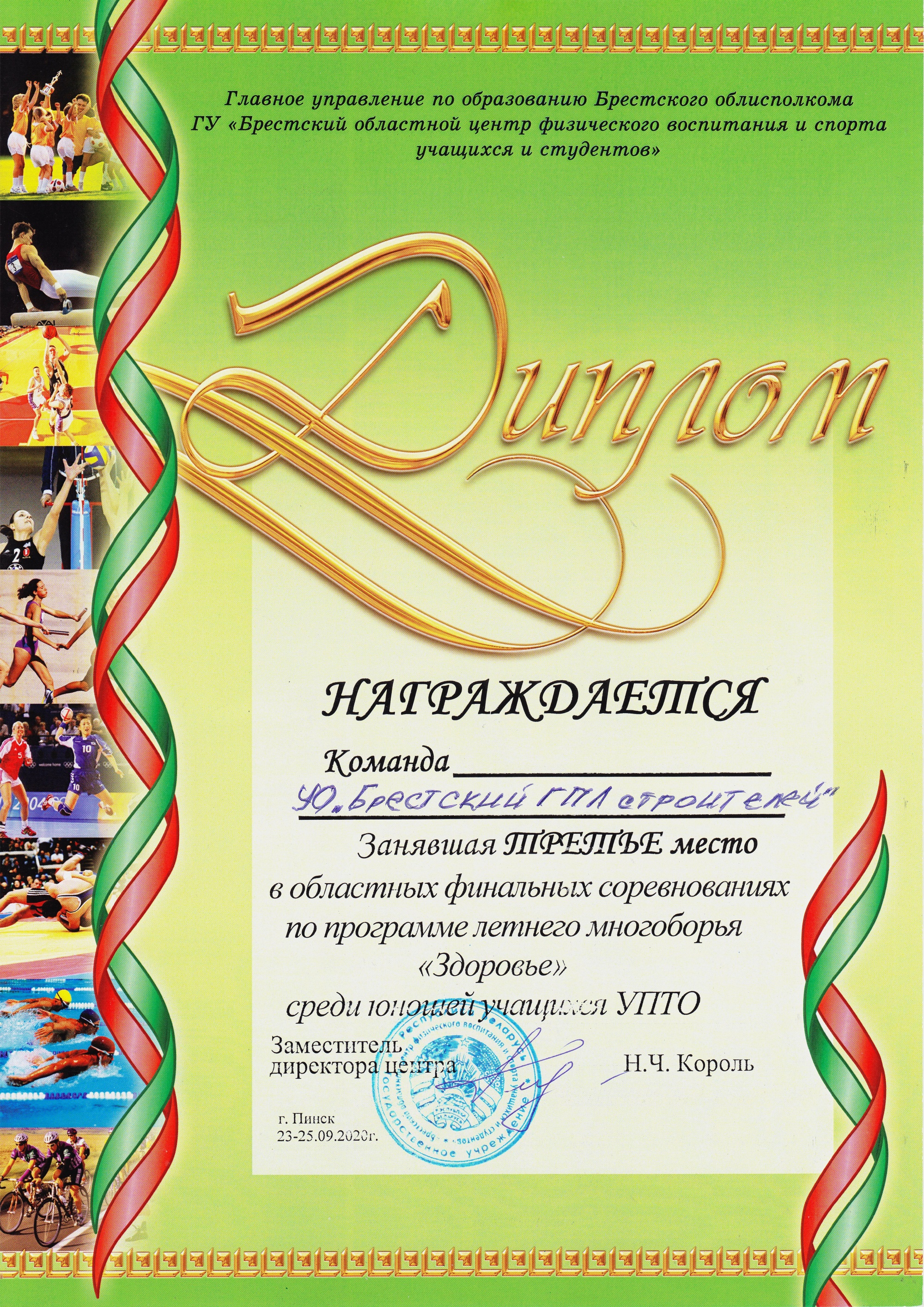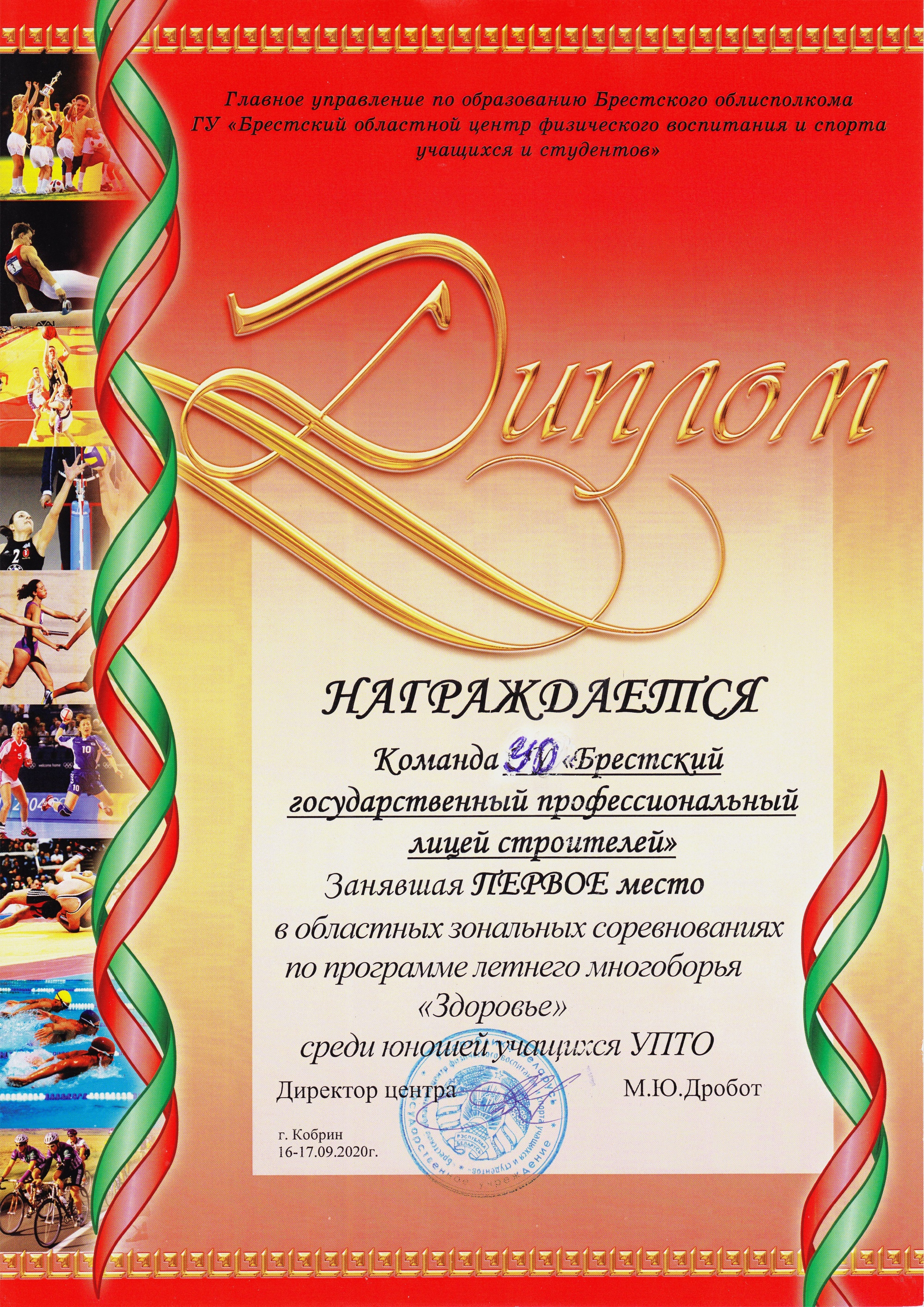 Команда учреждения образования «Брестский государственный профессиональный лицей строителей» приняла участие в соревнованиях по летнему многоборью среди юношей учреждений профессионально-технического образования. В областных зональных соревнованиях учащиеся завоевали Диплом I степени, в областных финальных соревнованиях – Диплом III степени.