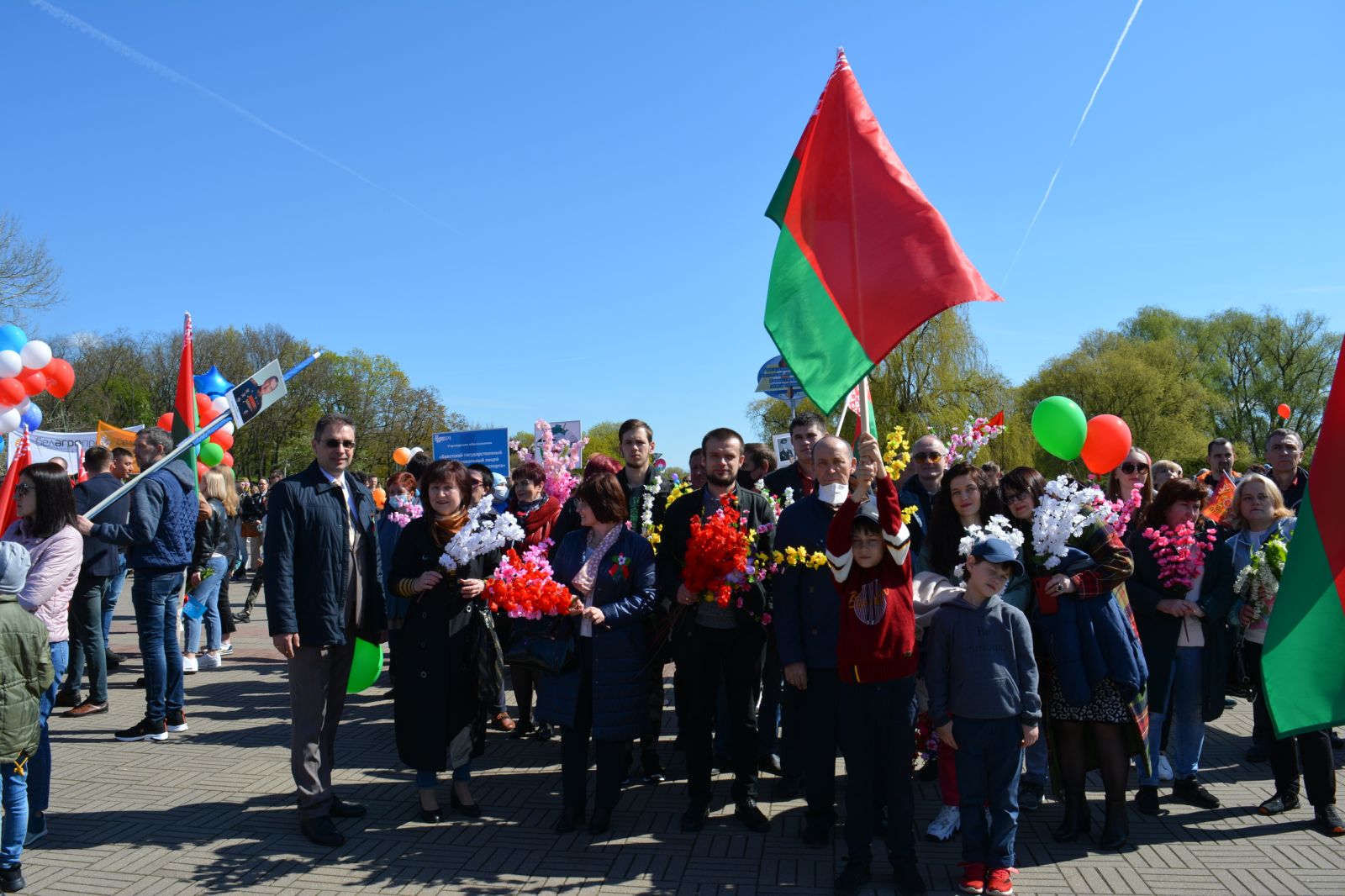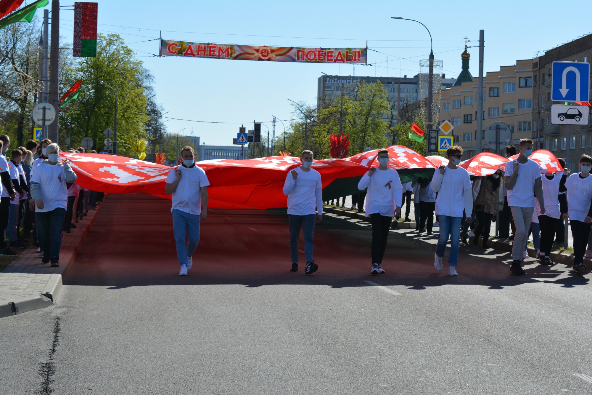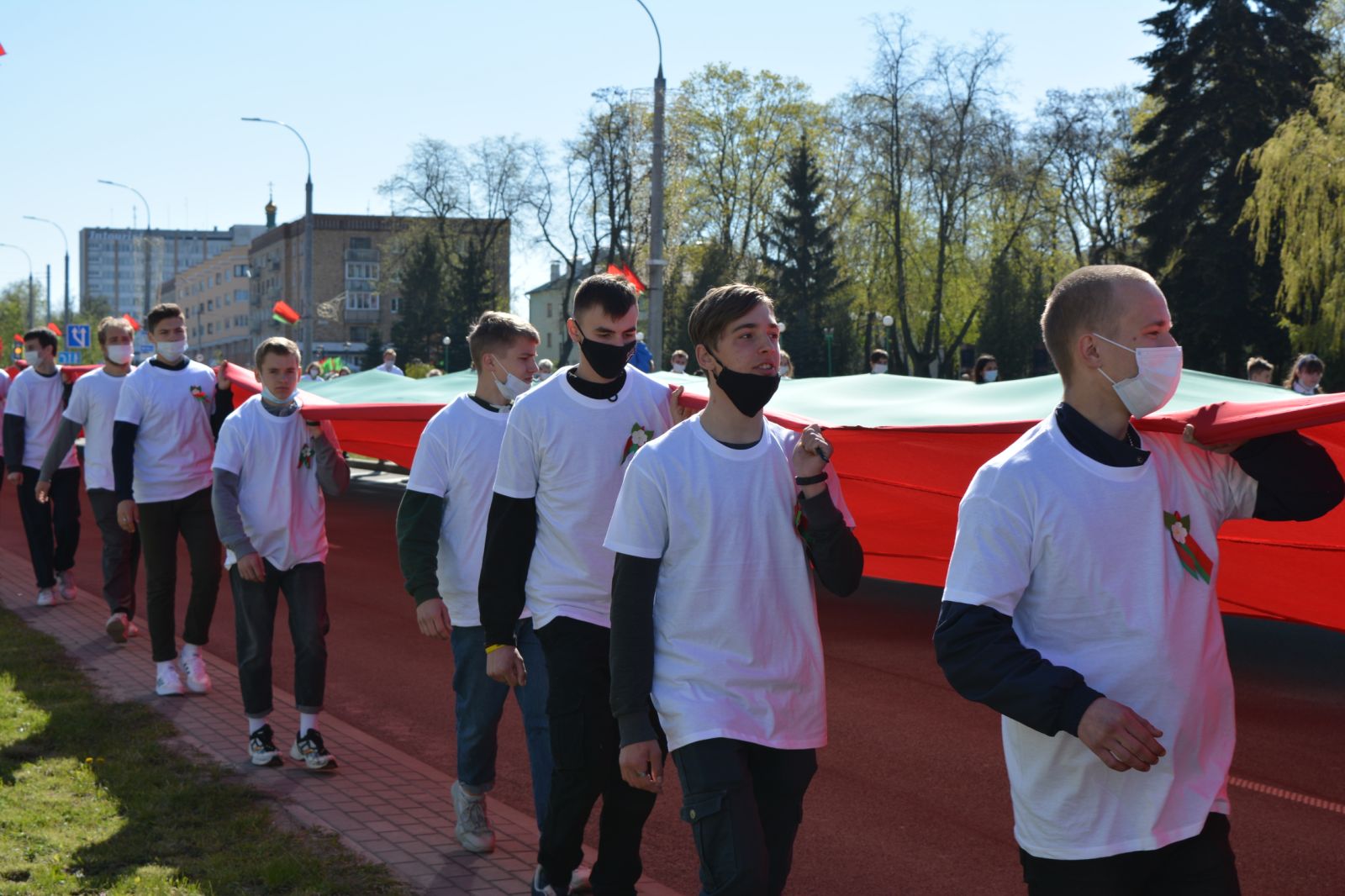 Так совпало, что в 2021-м году День флага и герба пришелся на 9 Мая. Студенческая молодёжь пронесла 100- метровое полотнище флага по главным улицам города от площади Ленина, где прошло торжественное мероприятие в честь Дня Государственного герба и Государственного флага.