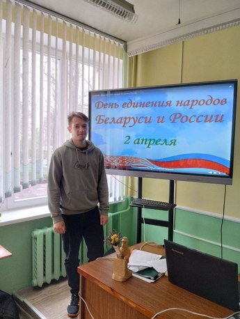 2 апреля в честь Дня единения народов Беларуси и России был проведён единый урок. Учащиеся совместно с педагогами колледжа обсудили модель Союзного государства, отметили необходимость добрососедских и союзнических отношений с Российской Федерацией. Ребята отметили слова Александра Григорьевича Лукашенко: "Одно Отечество - два народа. От Бреста до Владивостока".