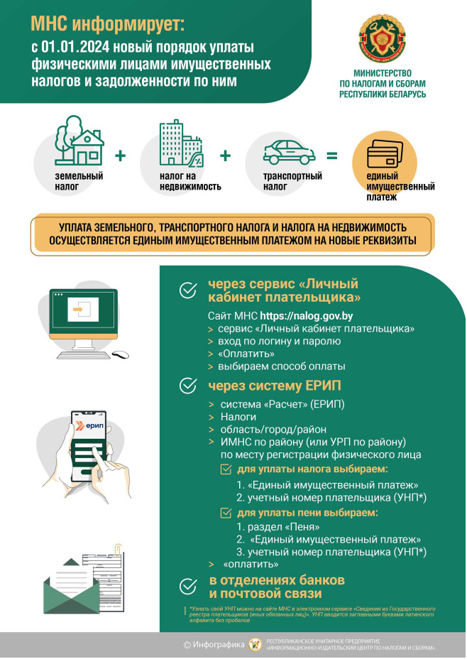 Инспекция Министерства по налогам и сборам Республики Беларусь по Ленинскому району г.Бреста сообщает, что срок уплаты единого имущественного платежа для физических лиц установлен не позднее 15 ноября 2024 года.