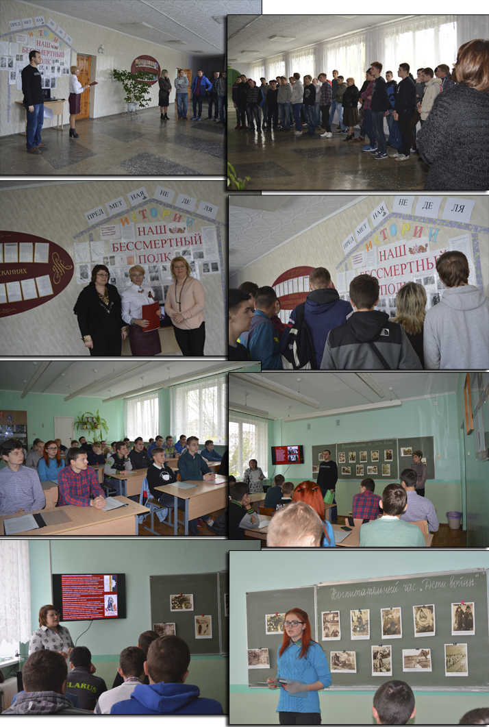 03.05.2017 прошла акция «Наш бессмертный полк» в память о тех, кто воевал, в память о тех, кто победил! Преподаватель истории Кичкайло А.В. рассказала учащимся о том, что датой рождения «Бессмертного полка» считается 9 мая 2012 года когда, во время празднования Дня победы, в Томске прошло первое шествие. Брест стал первым городом Беларуси, который присоединился к данной акции 9 мая 2014 года. 9 мая 2015 года, в год 70-летия победы, акция собрала под свои знамена около 1,5 тысячи человек. В этом году также пройдет акция «Бессмертный полк» 9 мая.